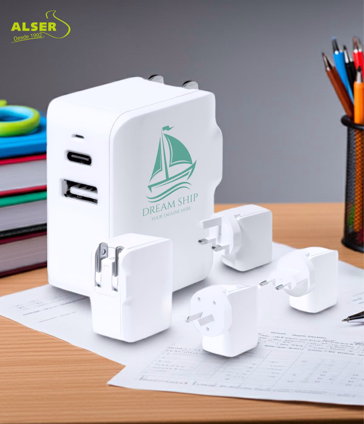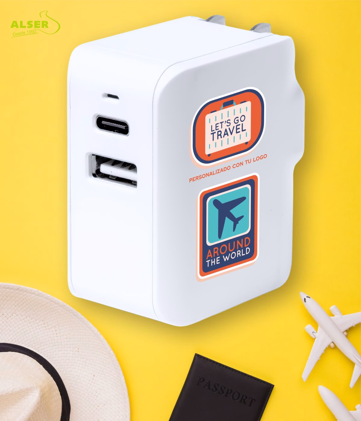 Porque es uno de esos gadgets que parecen pequeños, pero hacen la vida más fácil. Me encanta que sirva en tantos países, que incluya USB y Tipo C para cargar cualquier dispositivo, y que pese tan poco que ni notas que lo llevas. Además, con el logo impreso, tu marca se convierte en la llave que conecta al viajero con el mundo. Es práctico, elegante y siempre viene bien tenerlo en la mochila.