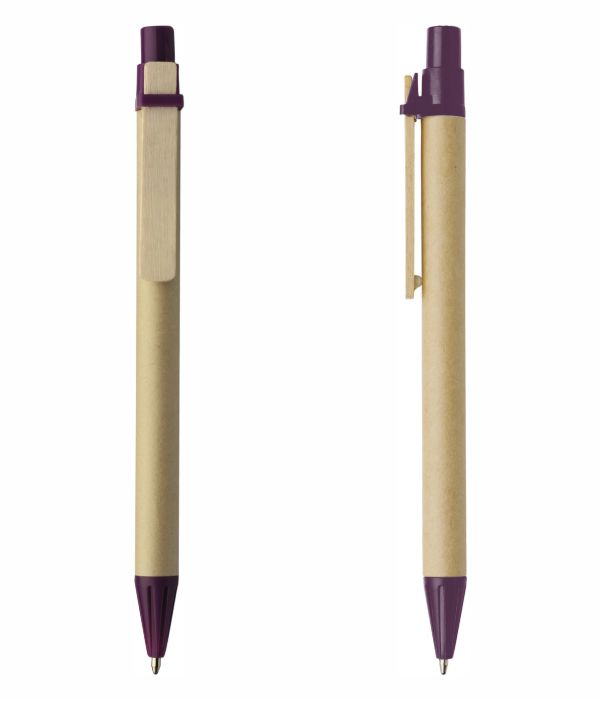 Bolígrafo ecológico promocional con caña de cartón y clip en madera, dos materiales que le dan una buena sintonía con el medio ambiente