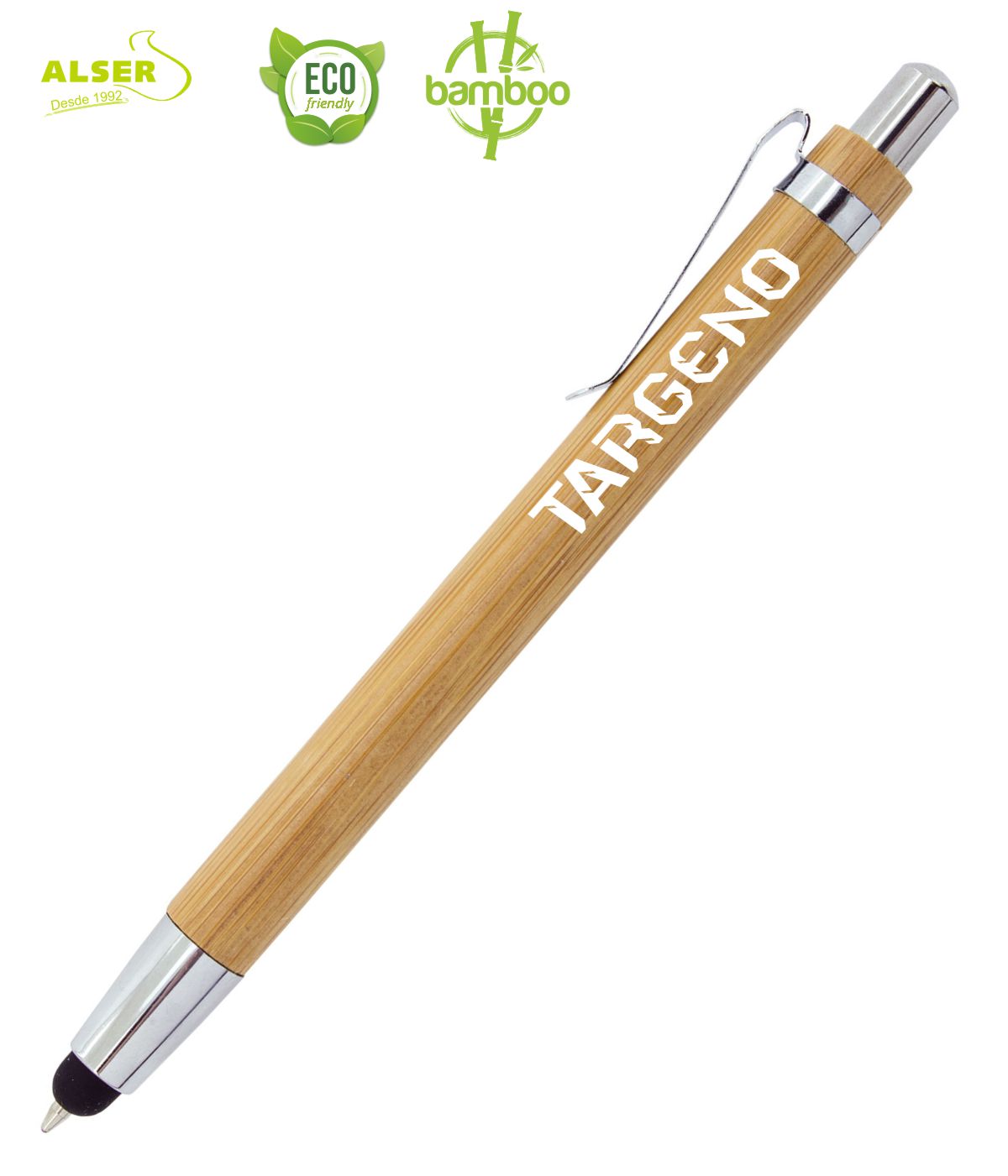 Fabricado en madera de bambú natural, este bolígrafo publicitario incorpora terminales plateados que le dan un toque profesional y sobrio. Pero lo mejor está en los detalles: incluye punta táctil (touch) para pantallas, lo que lo convierte en un regalo útil tanto para la oficina como para el día a día digital. ¡Y escribe en tinta negra, como los clásicos que nunca fallan!