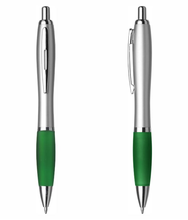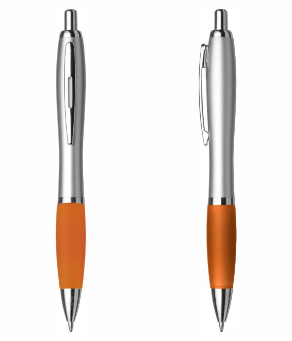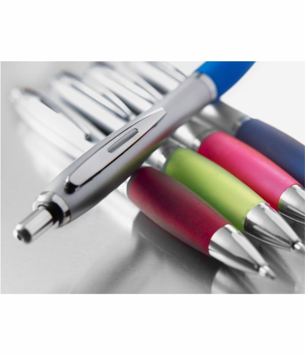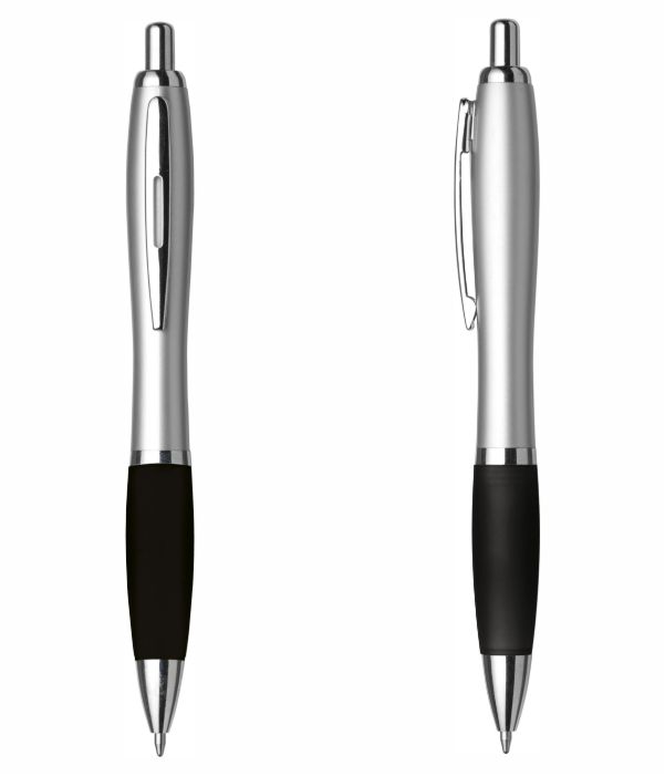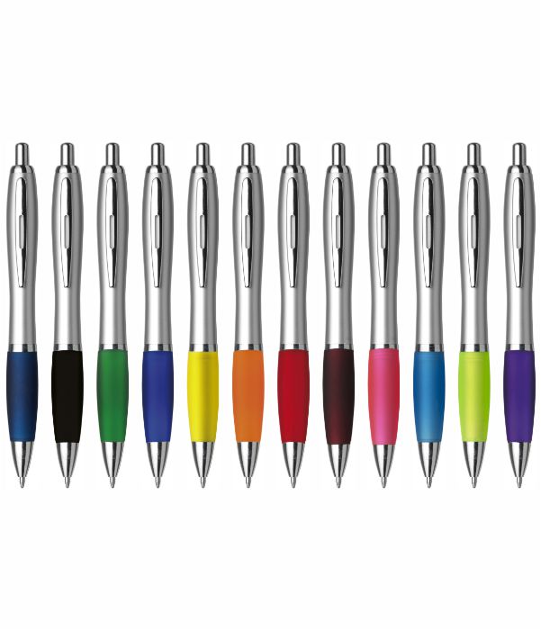 Bolígrafo merchandising de cuerpo plateado en plástico ABS, con grip de agarre de goma en multitud de colores entre los que seguro que encuentra el color de su imagen gráfica.