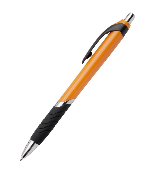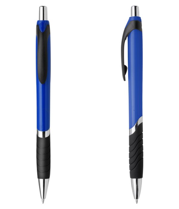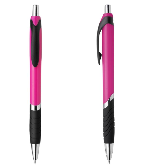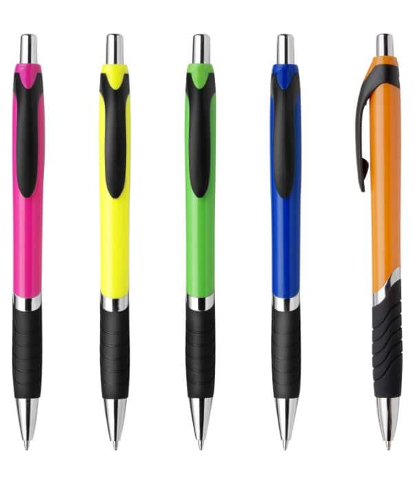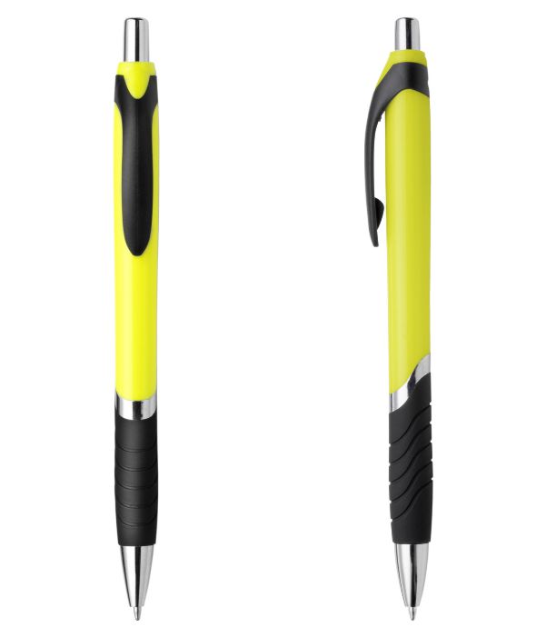 Llamativo bolígrafo publicitario de vivos colores con los terminales en negro.