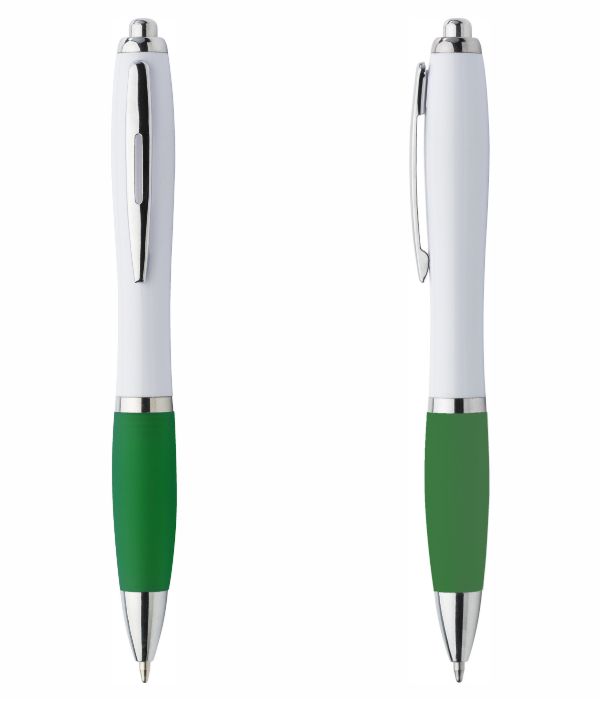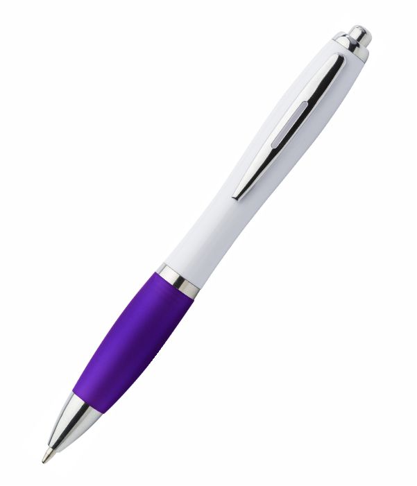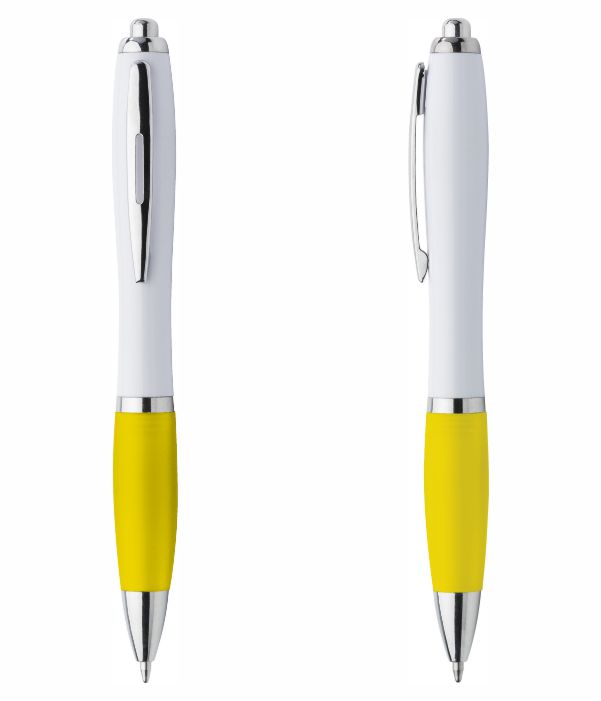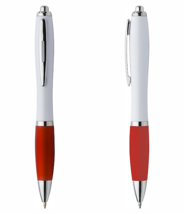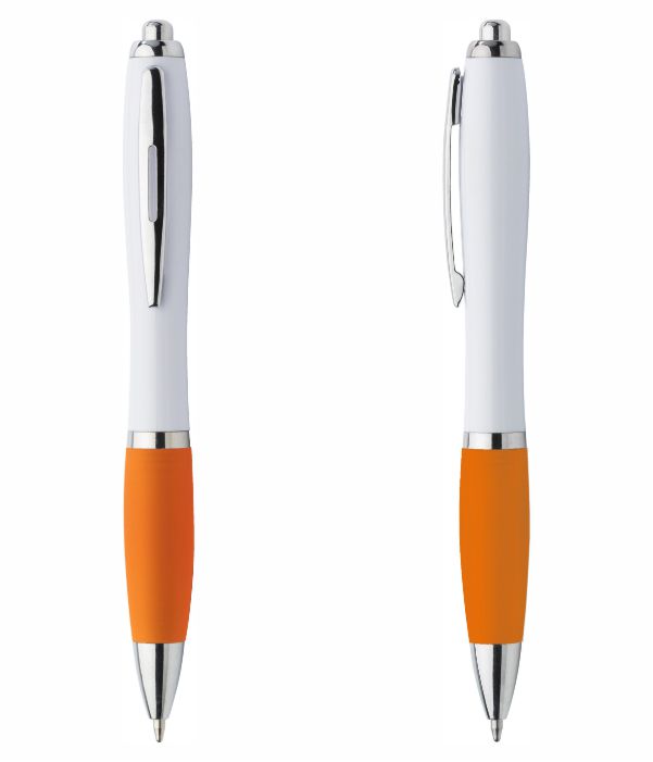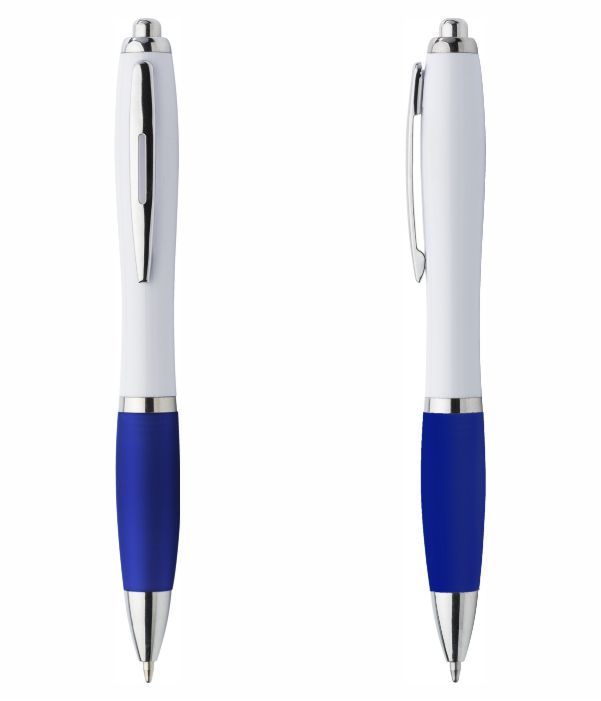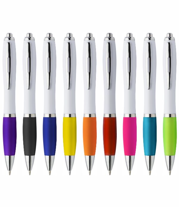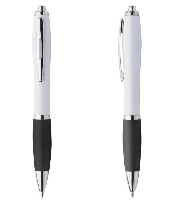 Bolígrafo de cuerpo blanco en plástico ABS, con grip de agarre de goma en multitud de colores entre los que seguro que encuentra el color más parecido a su logo.