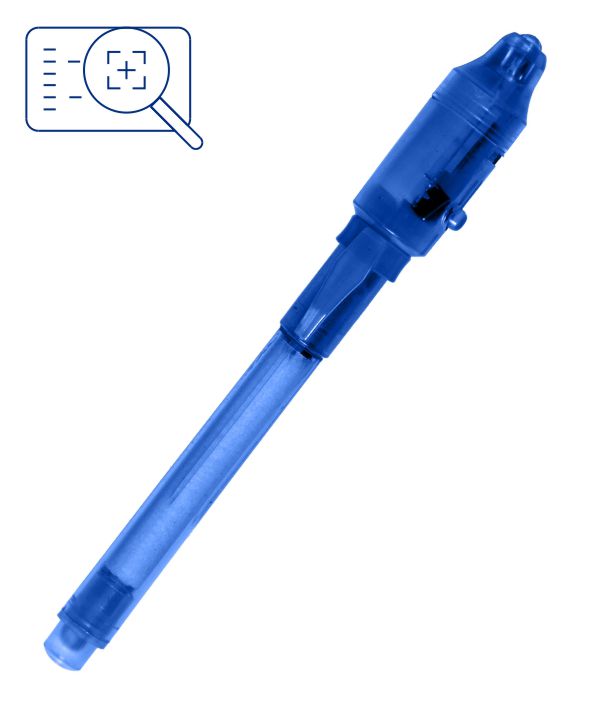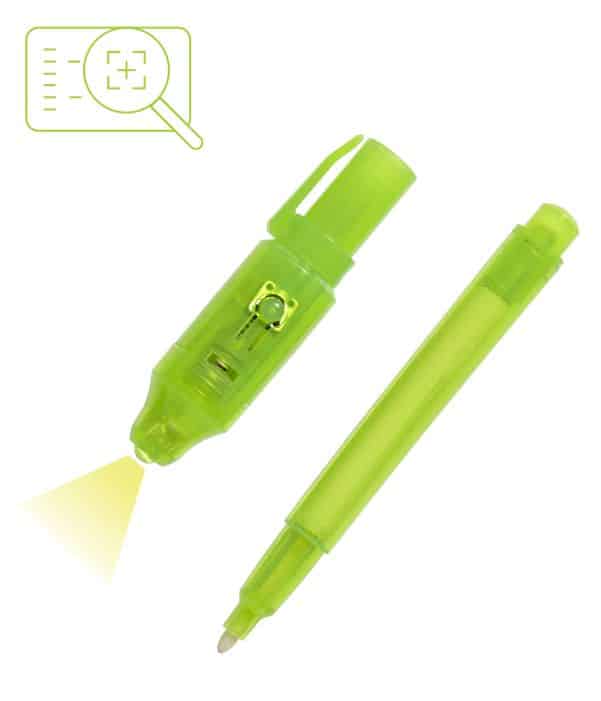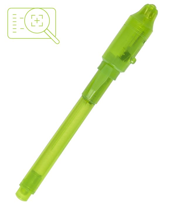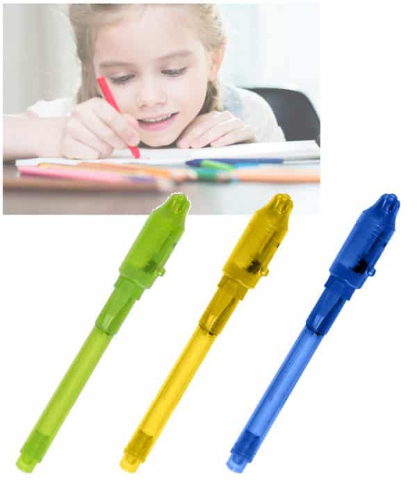La tinta es invisible después de escribir con ella, luz UV en la tapa para poder ver el mensaje secreto.