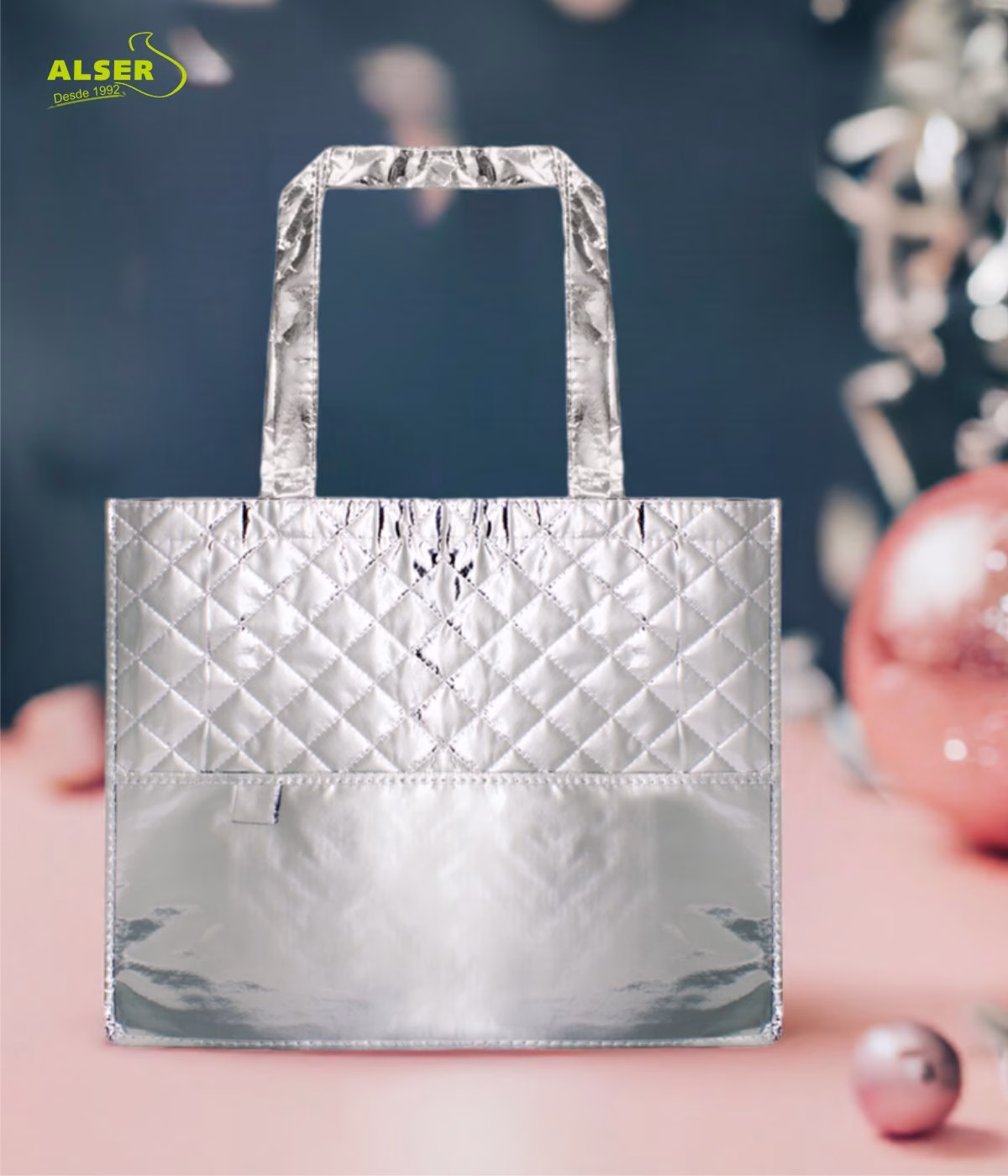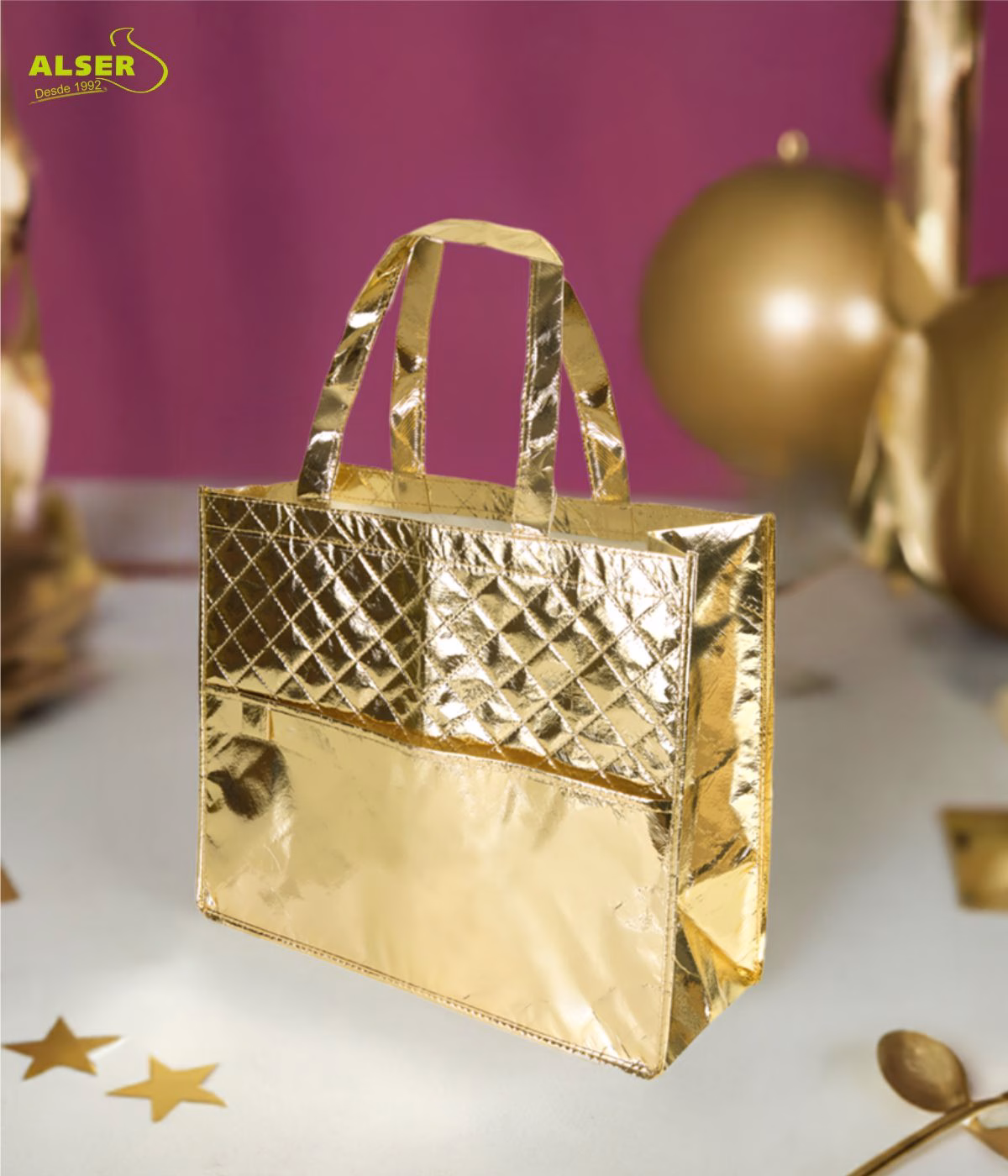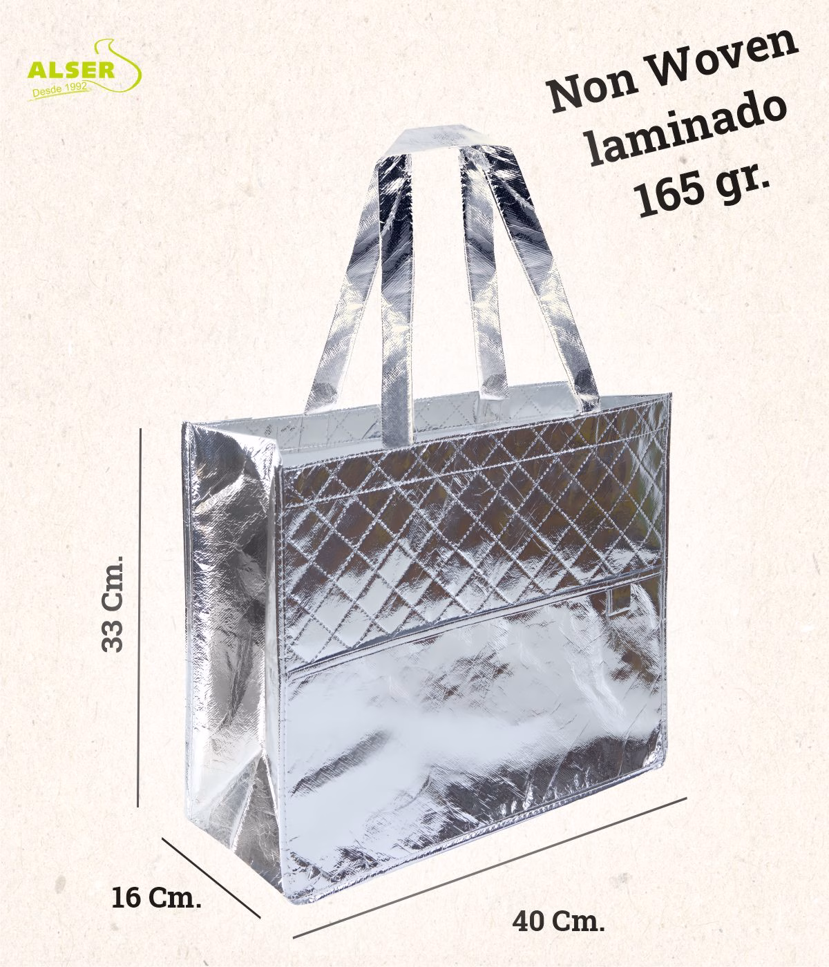 Nos encanta su acabado metalizado que no pasa desapercibido. La posibilidad de personalizarla con tu logo la convierte en un escaparate andante para tu marca. Es resistente y puede cargar hasta 5 kg sin problema, perfecta para cualquier ocasión. Y, por supuesto, cada detalle suma, desde su práctico bolsillo exterior hasta el toque de sofisticación que aporta a cualquier evento.