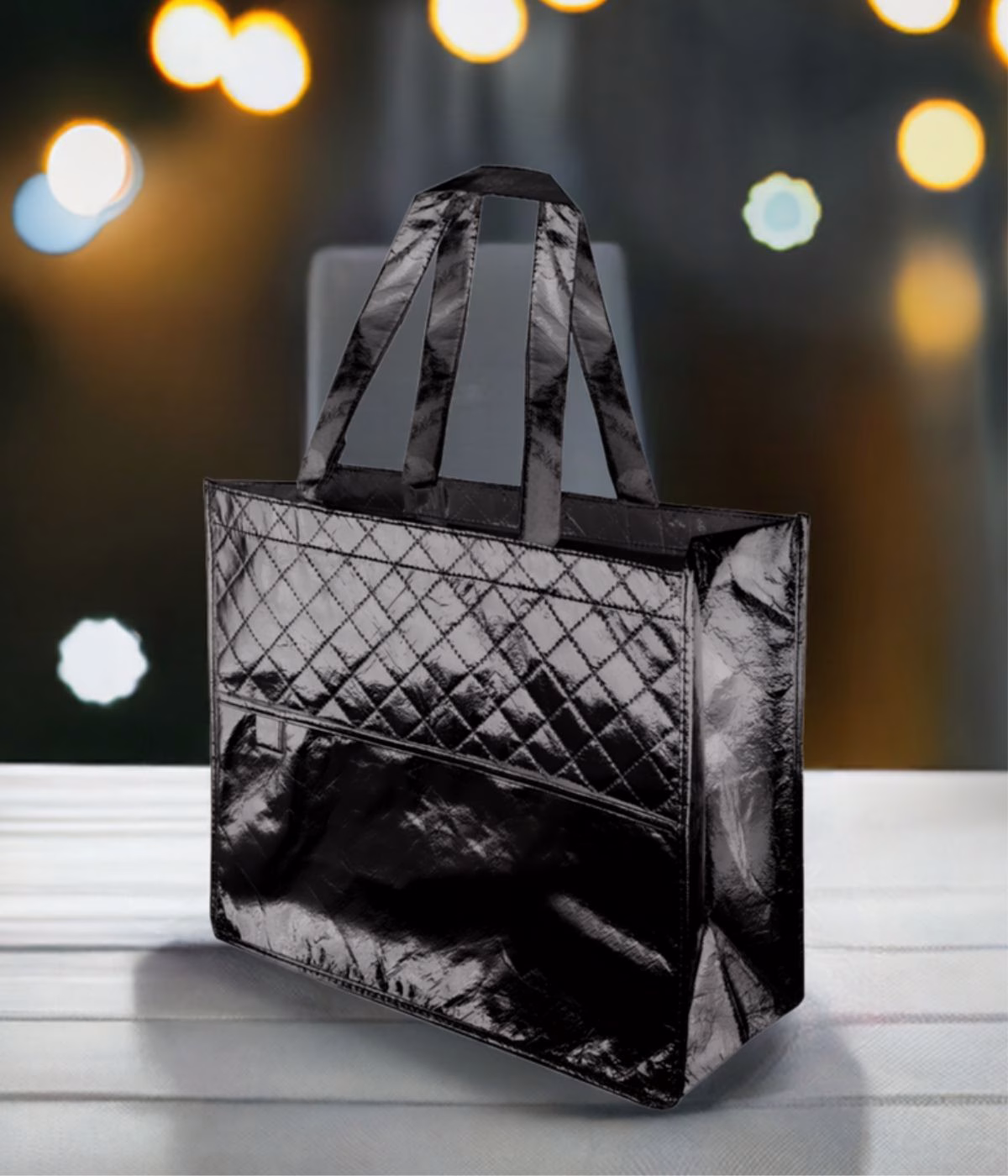 Con un toque de sofisticación, esta bolsa brillante cuenta con un acabado extra brillo en colores negro, plata y oro. Sus asas reforzadas de 55 cm, su fuelle amplio y su acabado cosido la convierten en un accesorio práctico y llamativo. Además, incorpora un bolsillo exterior y un práctico sujeta bolígrafos, porque el detalle importa.