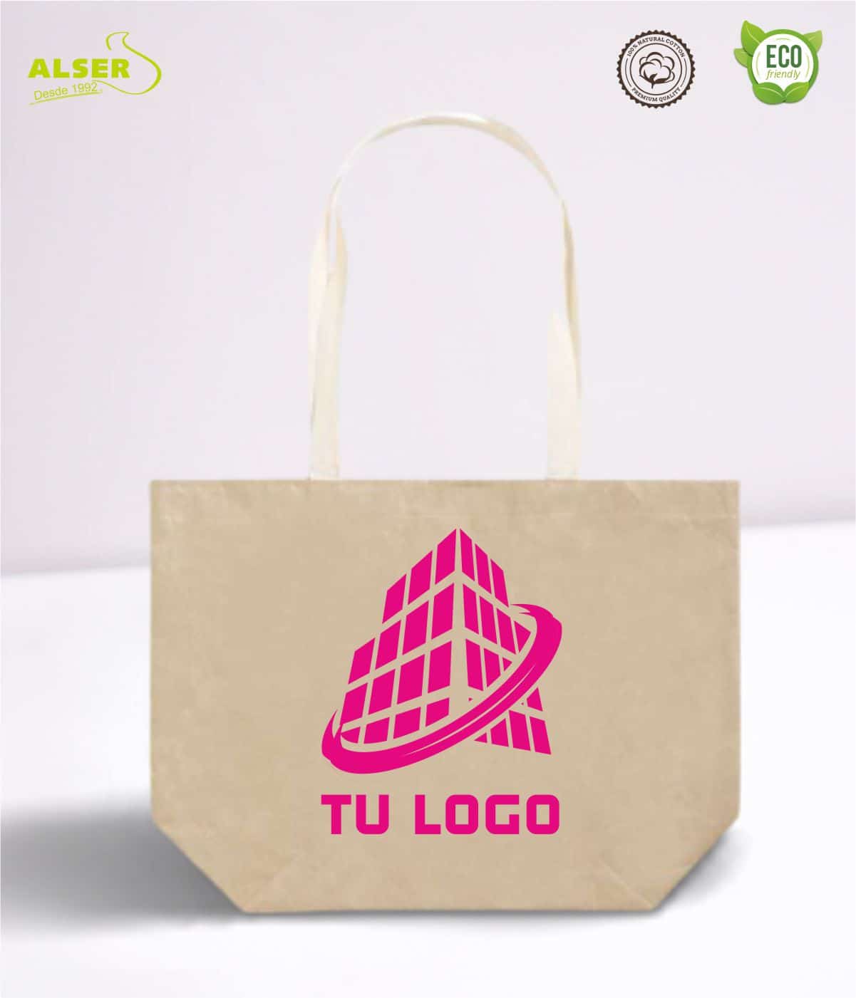 • Asas largas fabricadas en algodón natural. Las asas largas son mas cómodas y versátiles permitiendo llevar la bolsa al hombro.