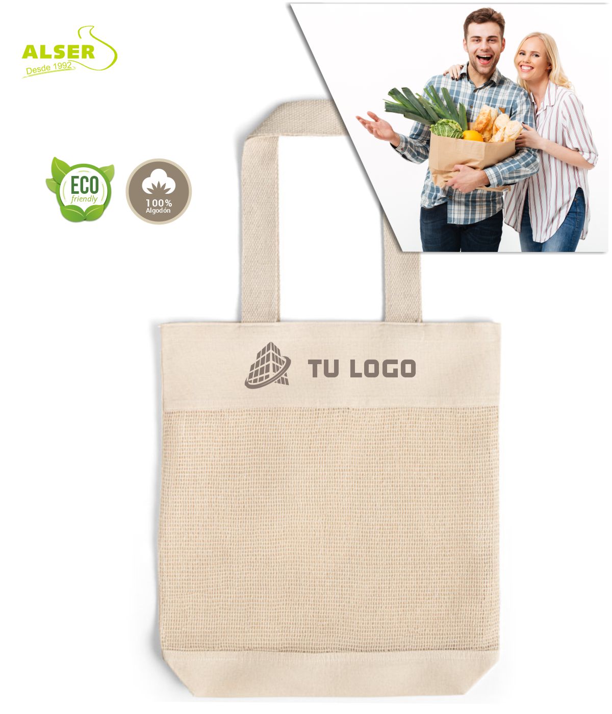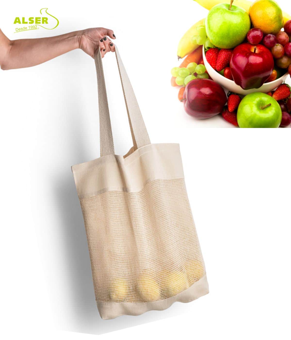 Ligera, ecológica, práctica y con mucho rollo natural. Así es esta bolsa de malla, el accesorio perfecto para los que llevan el mundo un poco más verde… y tu logo siempre a la vista. Confeccionada en algodón 100% natural, su parte frontal de red deja respirar la fruta y la verdura como se merecen. Y sí, también respira tu marca: porque cuando algo se usa cada semana, ¡se ve cada semana!