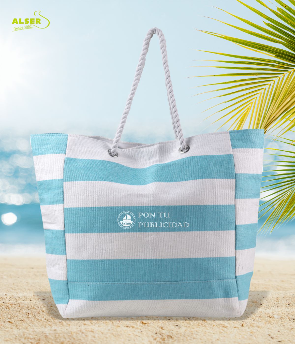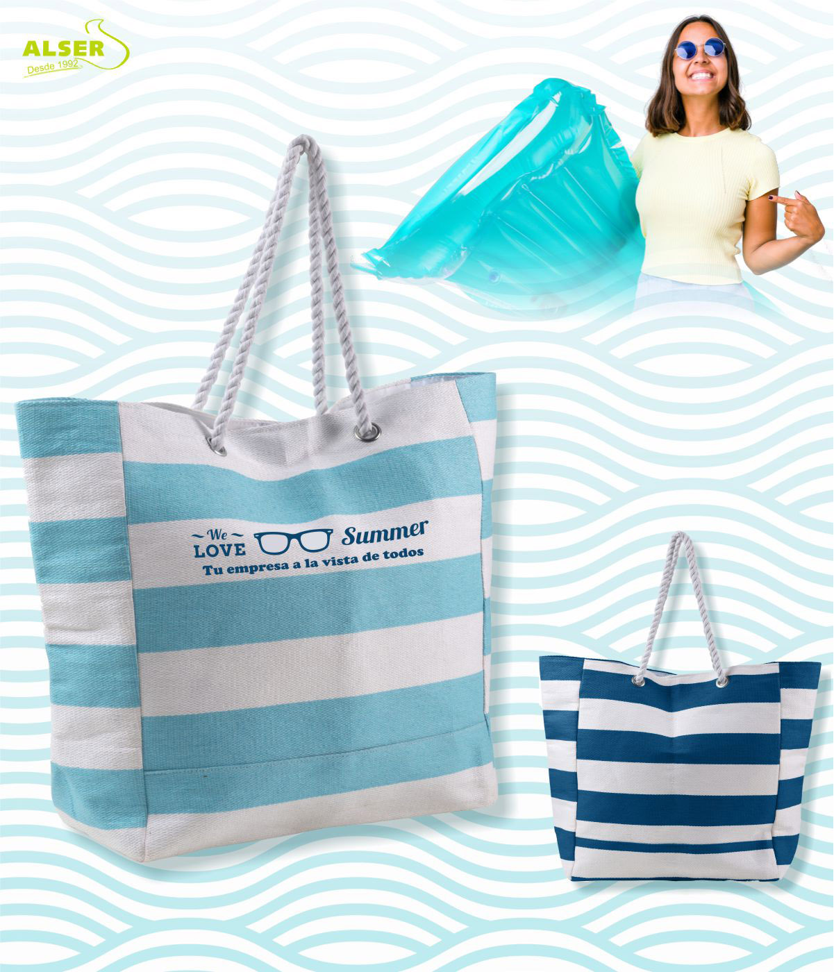 ¿Qué es? Una bolsa de playa con estampado a rayas que transporta al mar la publicidad de tu negocio..