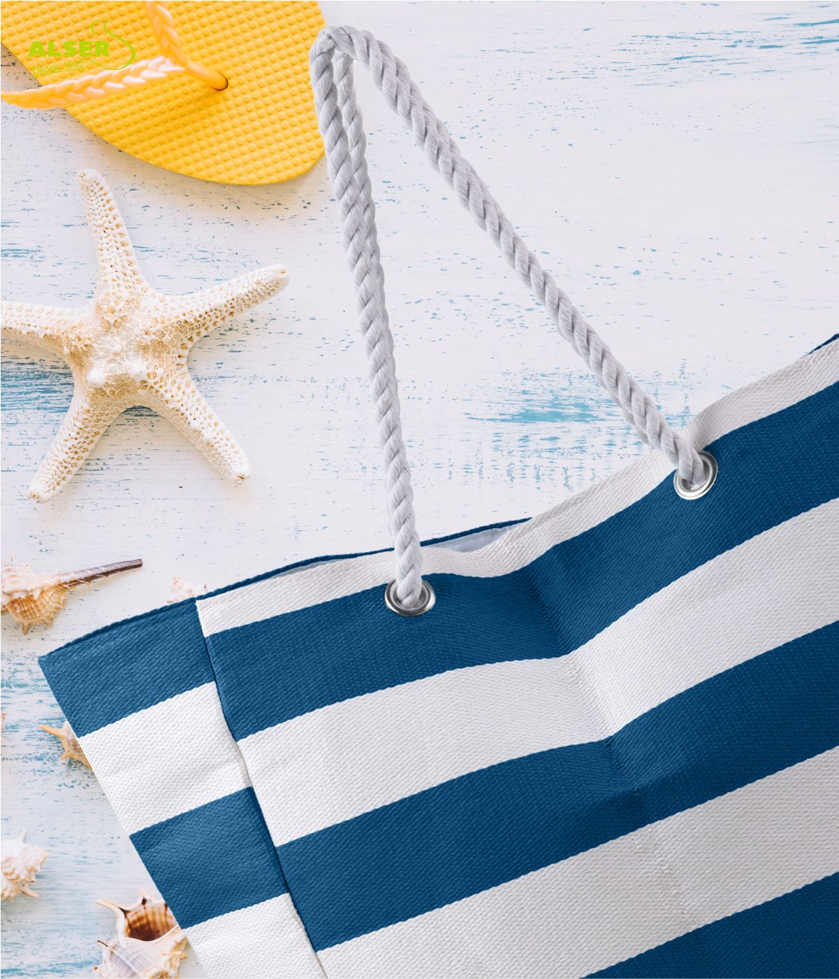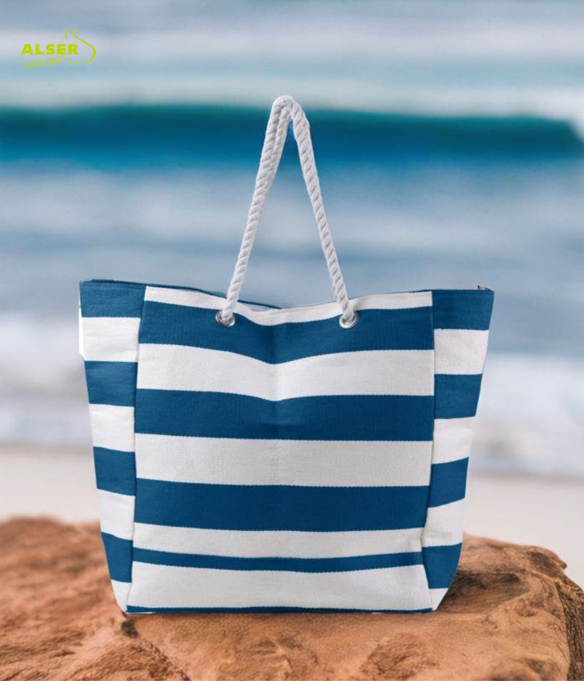 Bolsa de playa con estampado a rayas que consigue que tus clientes no se olviden de tu negocio ni estando frente al mar.