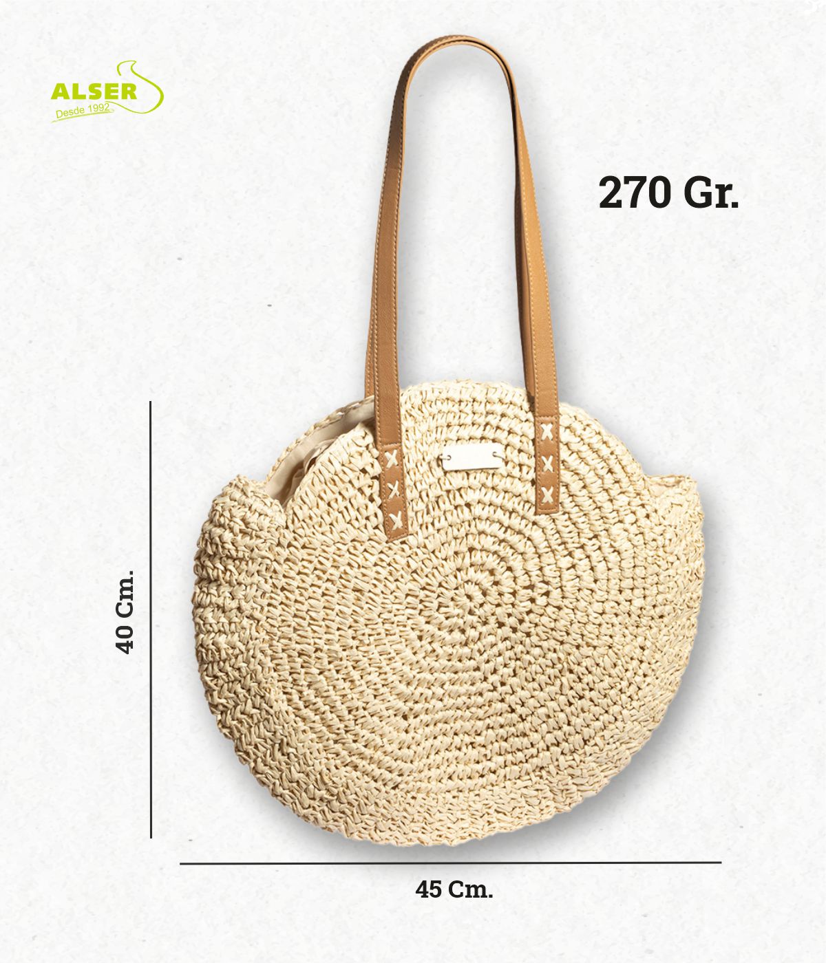 Porque tiene ese look natural que pega con todo y nunca pasa de moda. Porque su diseño circular es diferente, llamativo y muy cómodo. Porque aguanta carros y sombrillas gracias a sus asas reforzadas. Y porque puedes grabar tu logo en madera y hacer que tu marca se cuele en las mejores fotos del verano. Si hay que elegir un capazo promocional con rollo… ¡es este!