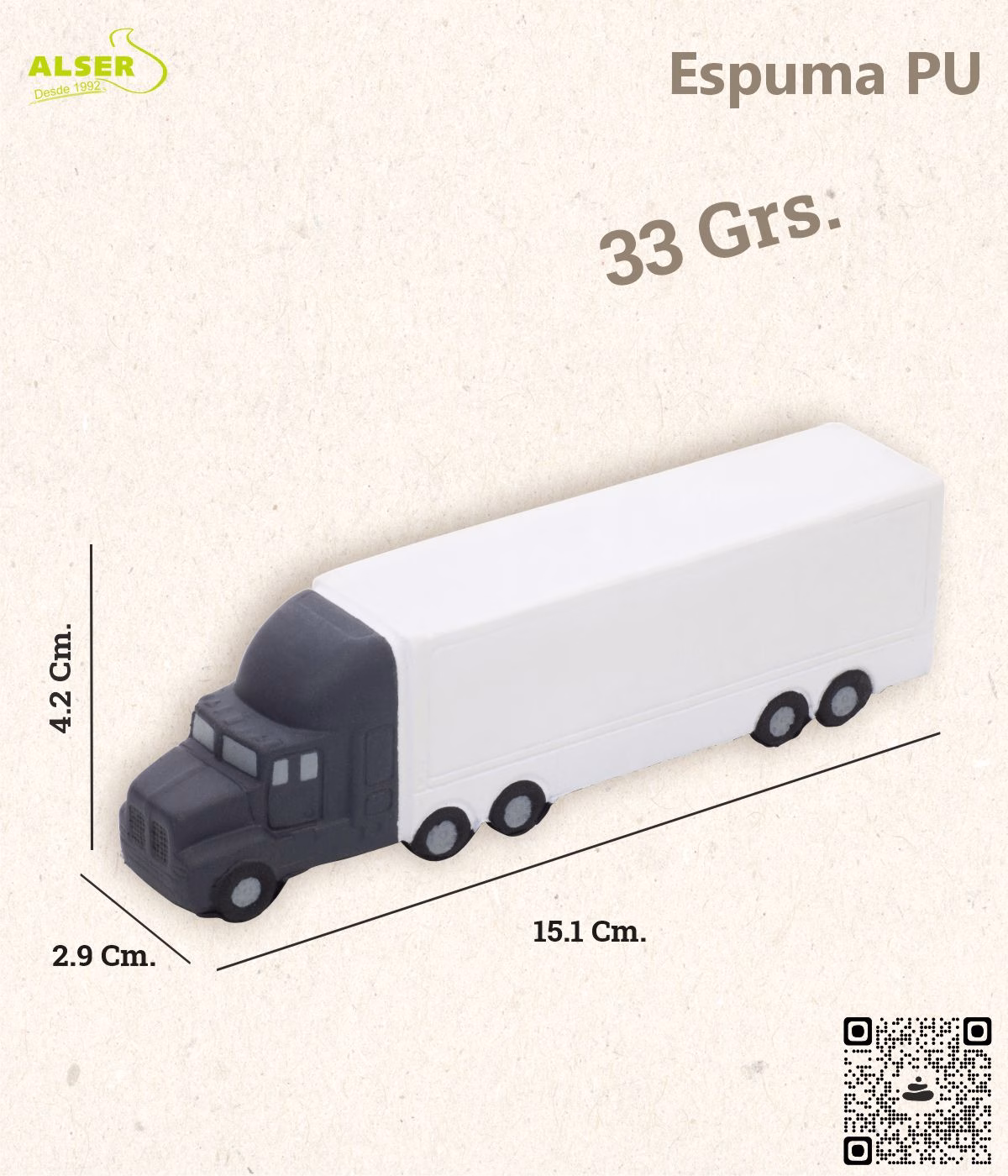 Este antiestrés camión mide 15,1 x 2,9 x 4,2 cm, pesa 33 gramos y es tan fácil de llevar como de apretar. Se presenta en bolsita individual y se puede personalizar en láser o tampografía a un color. ¿Dónde? En los laterales del cuerpo y en el techo, para que tu logo tenga máxima visibilidad. Si quieres asegurarte de que queda perfecto, en Alser, regalos publicitarios te enviamos un fotomontaje gratuito antes de confirmar el pedido.