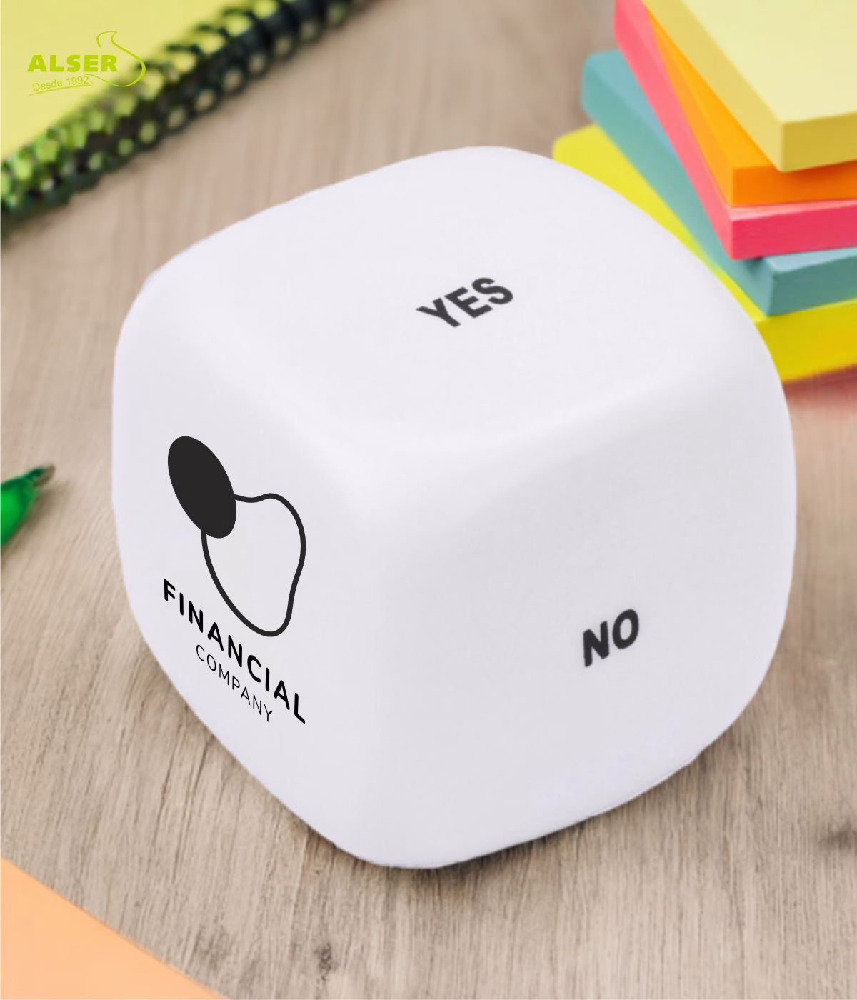 Este dado antiestrés es perfecto para aportar un toque diferente en oficinas, ferias y eventos corporativos. Lo personalizas con tu logo en una de sus caras y, con cada lanzamiento, tu marca se hace notar. Es ligero, cómodo y un accesorio divertido que rompe la monotonía de cualquier jornada. Además, su diseño en blanco con letras en negro le da un aire moderno y profesional. Se presenta en bolsa individual y está disponible desde 0,83 € hasta 2,41 €, adaptándose a cualquier presupuesto.