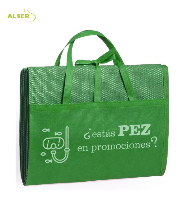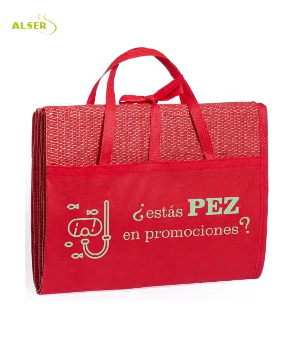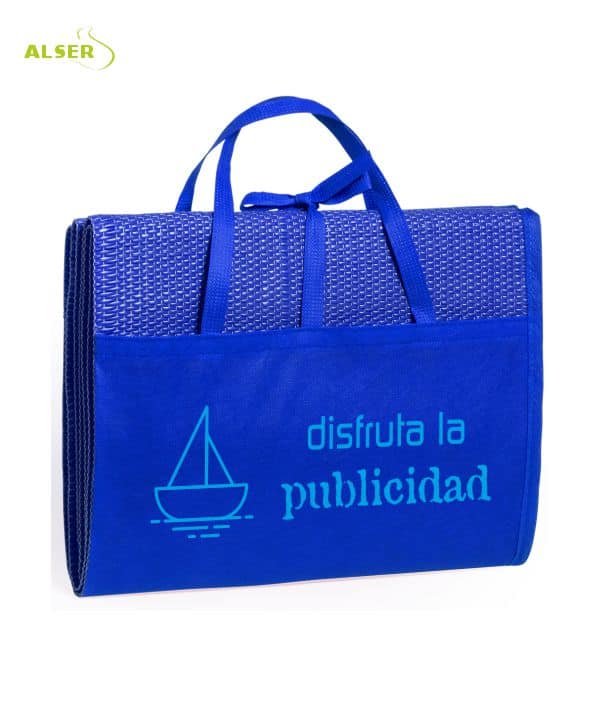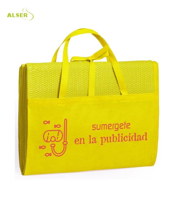Cómoda de llevar con su cinta de cierre y asas de transporte, sus clientes la llevarán muy fácilmente siendo su publicidad muy vista