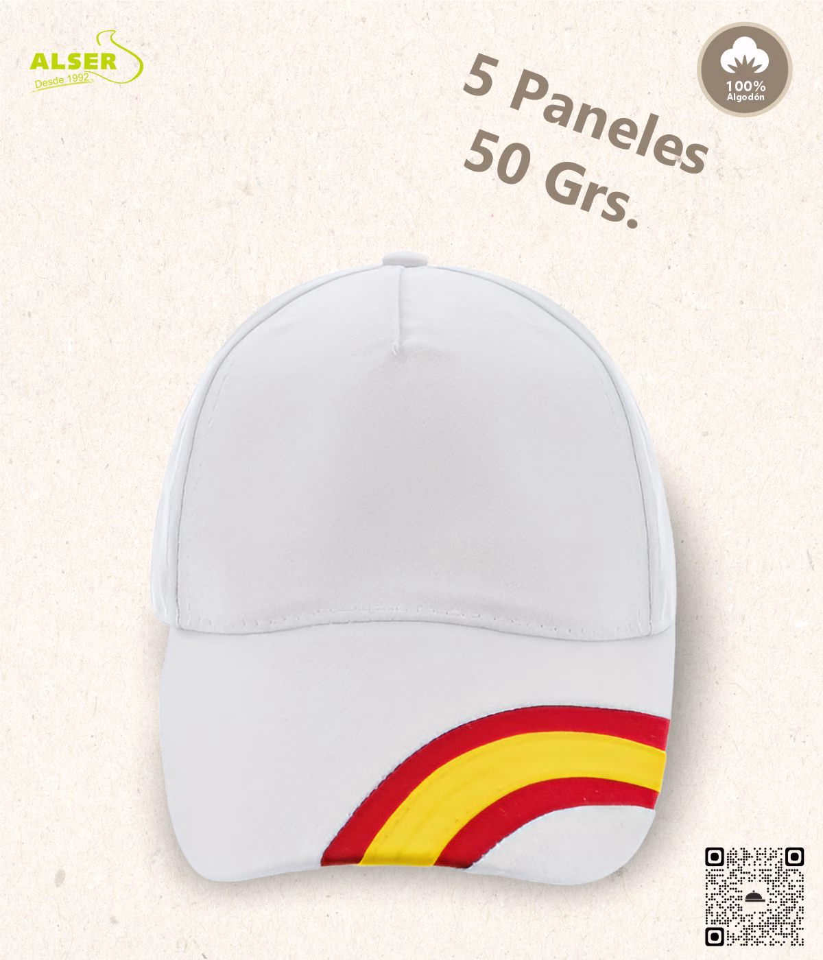 Confeccionada en algodón peinado 100%, tiene 5 paneles con ojales bordados de transpiración, visera con la bandera de España cruzando en arco desde el lateral izquierdo al centro y un cierre de velcro ajustable que se adapta a todas las tallas. Todo eso en solo 50 gramos de puro carácter.
