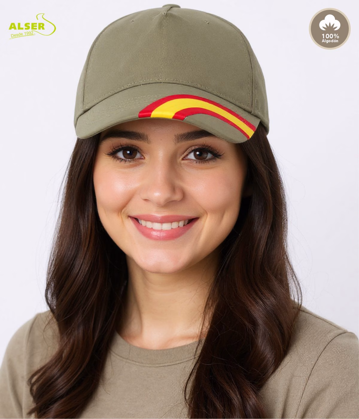 La gorra con bandera de España en la visera cuenta con detalle del arco tricolor en la visera le da un toque de fuerza visual que refuerza cualquier mensaje promocional o institucional.