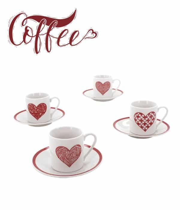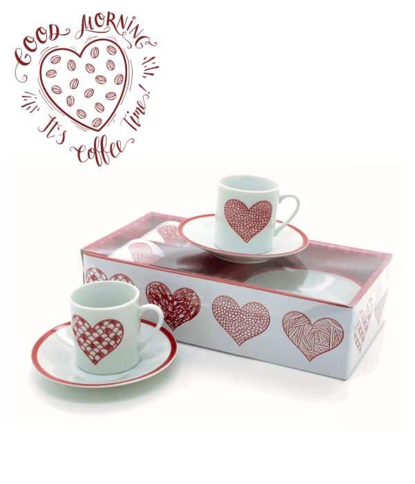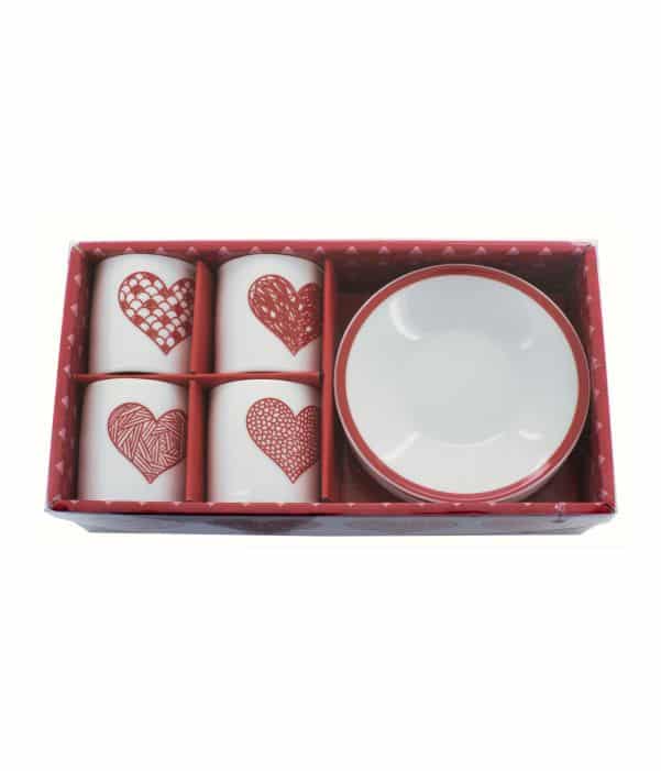 El set contiene 4 tazas ilustradas con diferentes corazones y 4 platos.