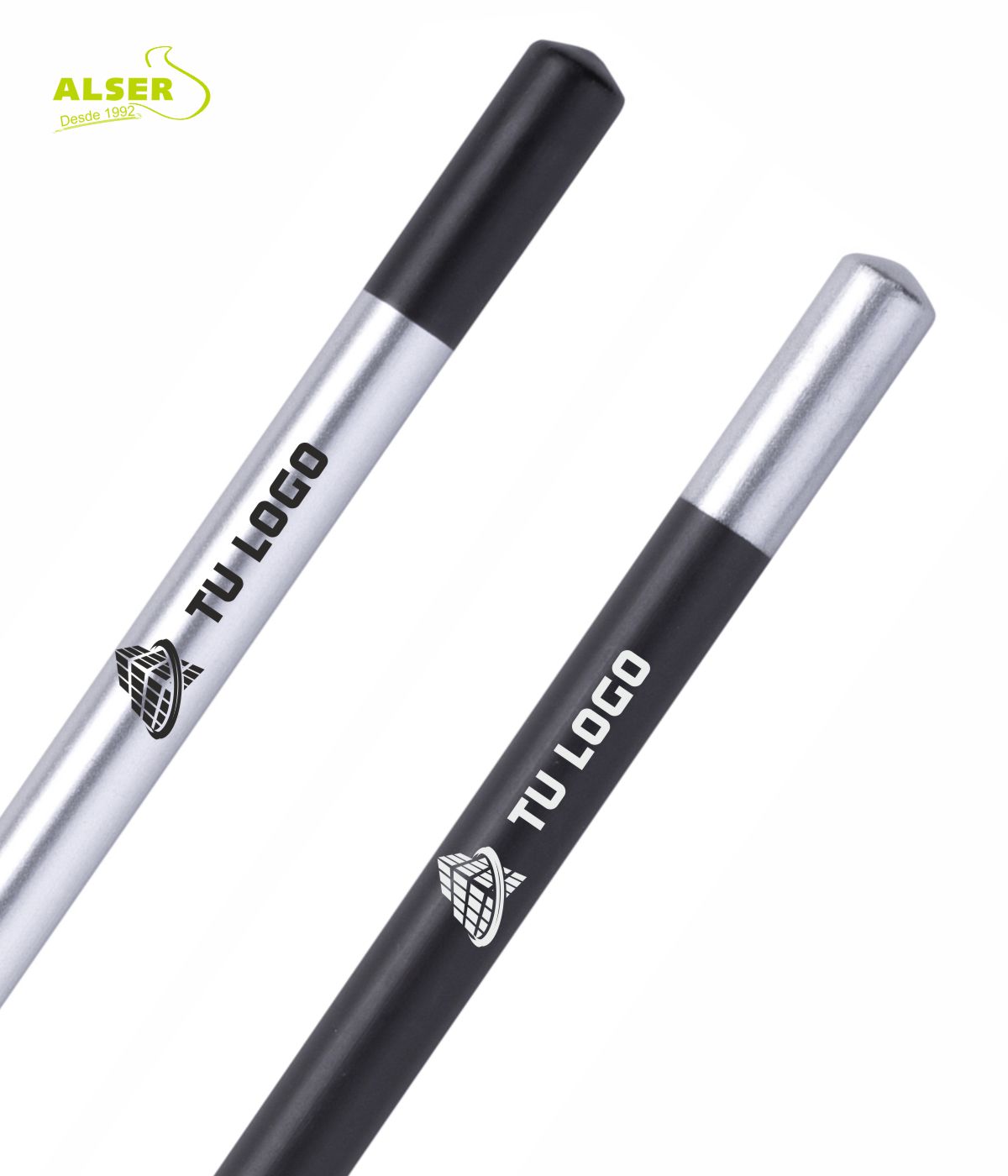 Este lapicero con su tacto lacado y sus colores combinando negro y plata lo puedes personalizar con tu logotipo o tus datos con hasta cuatro colores.