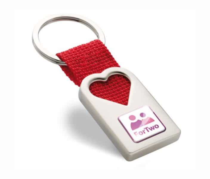 Llavero de metal en forma de corazón con acabado en efecto perla mate y con una tira de color rojo de poliéster.