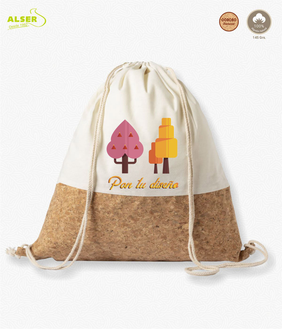 Fabricada con materiales sostenibles (algodón de 145 g/m² y corcho), no solo cuidas el planeta, sino que también llevas estilo a donde vayas. Y no te preocupes, es fácil de personalizar: serigrafía, transfer a todo color o bordado. ¡Como más te guste!
