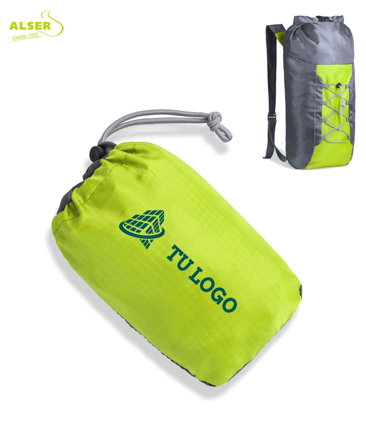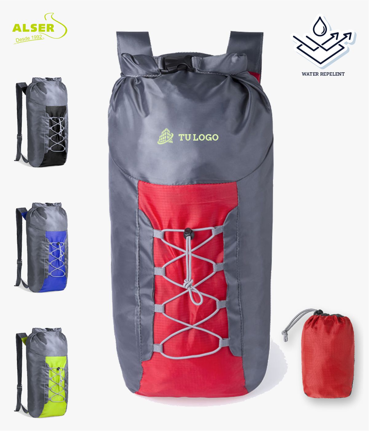 - Puedes personalizar la mochila deportiva plegable hasta un color en serigrafía o hasta ocho colores en transfer serigráfico.