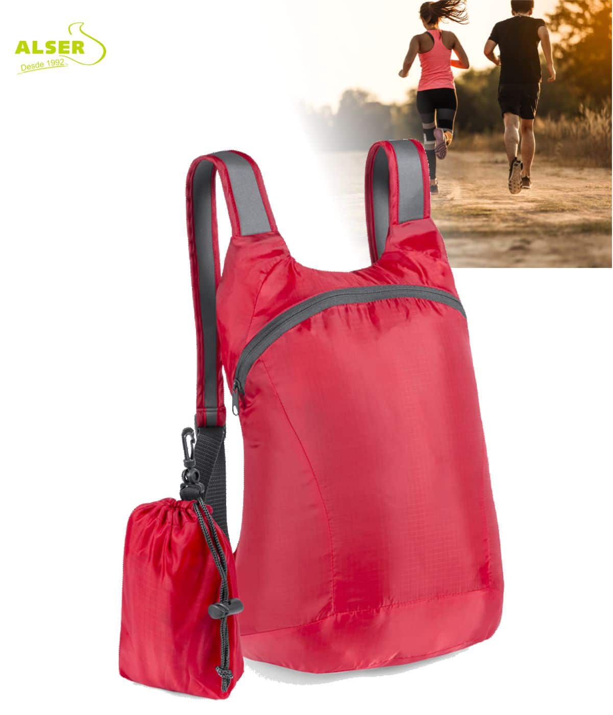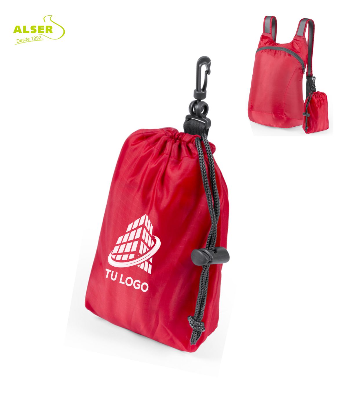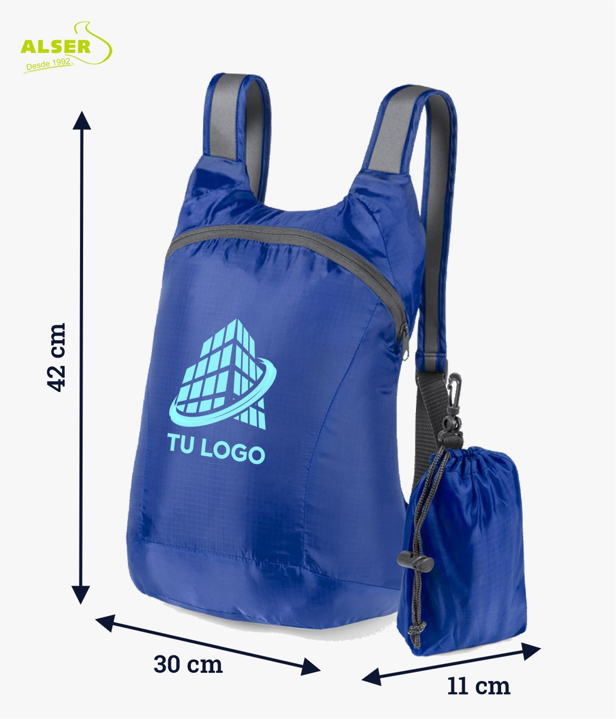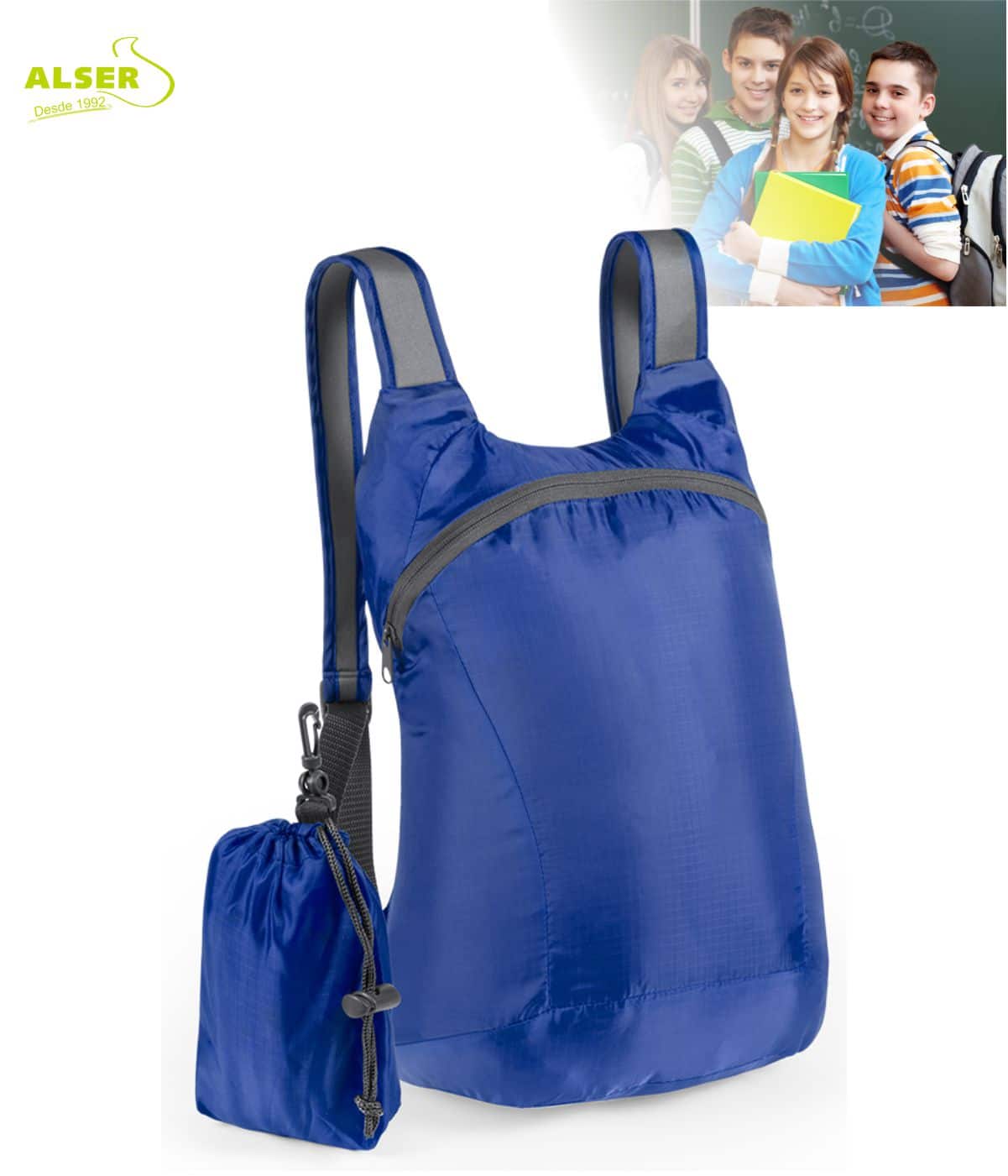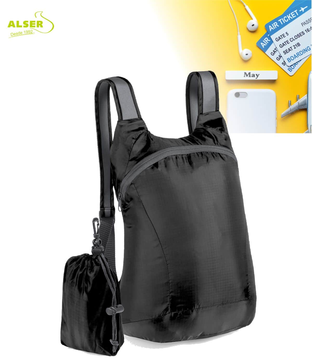 Además, puedes personalizar el frontal o la propia bolsa plegada, logrando aún más impacto visual cuando la mochila todavía está guardada. Marketing inteligente.