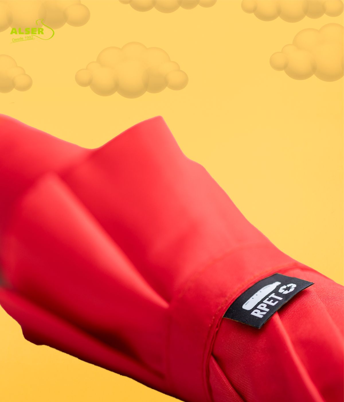 Eso, y todo lo que le puedes pedir a un paraguas de calidad: Comodidad y funcionalidad, apertura automática, mango y caña de madera, varillas metálicas y cierre de velcro, y un vistoso distintivo RPET en la tira de cierre que certifica su origen reciclado, y muestra el compromiso de tu negocio con el medio ambiente.
