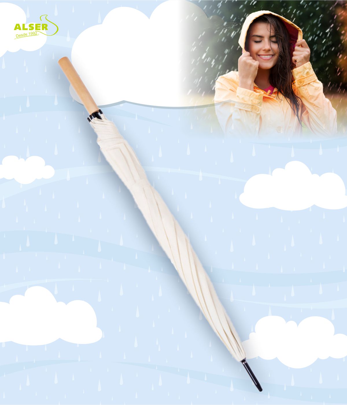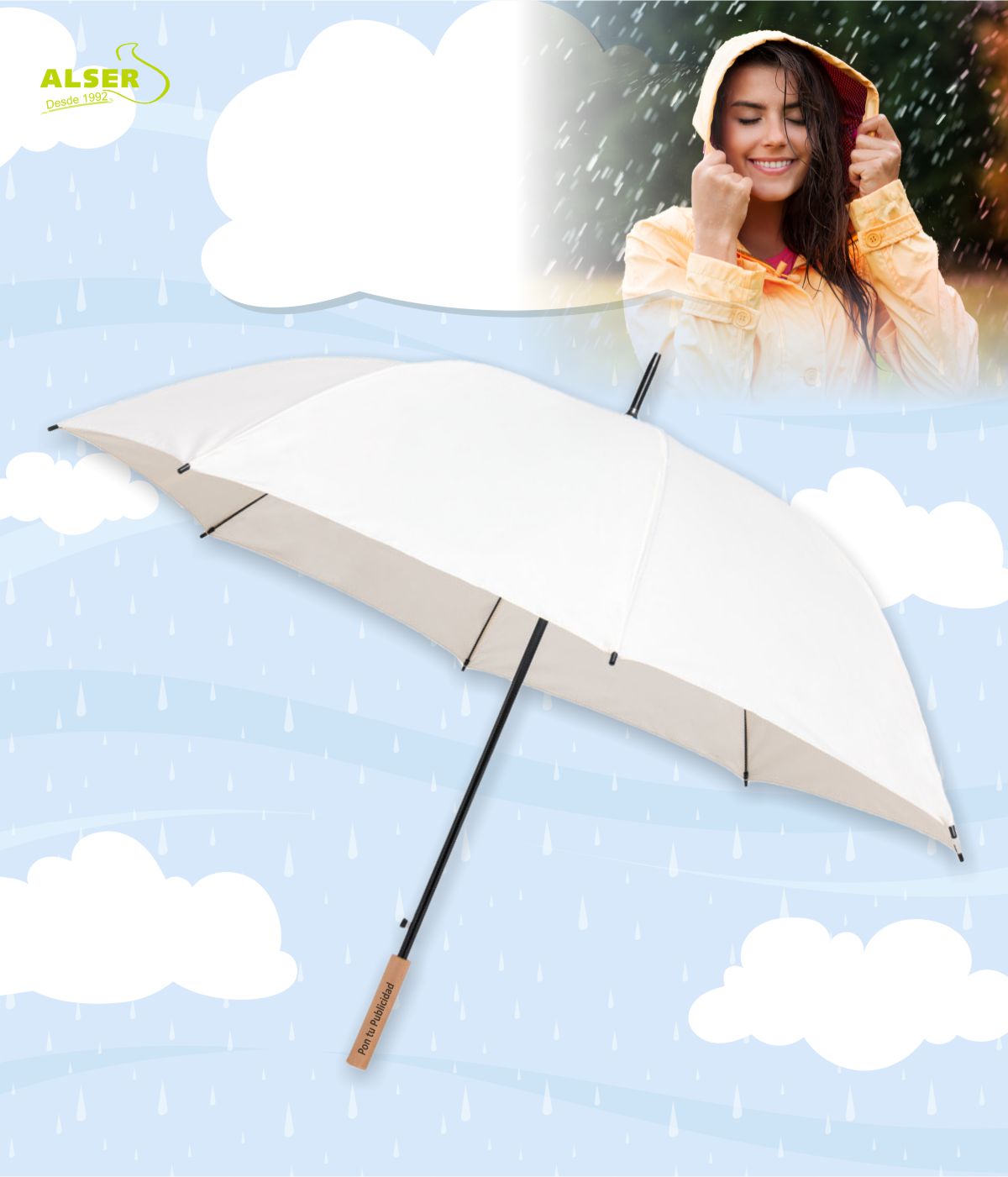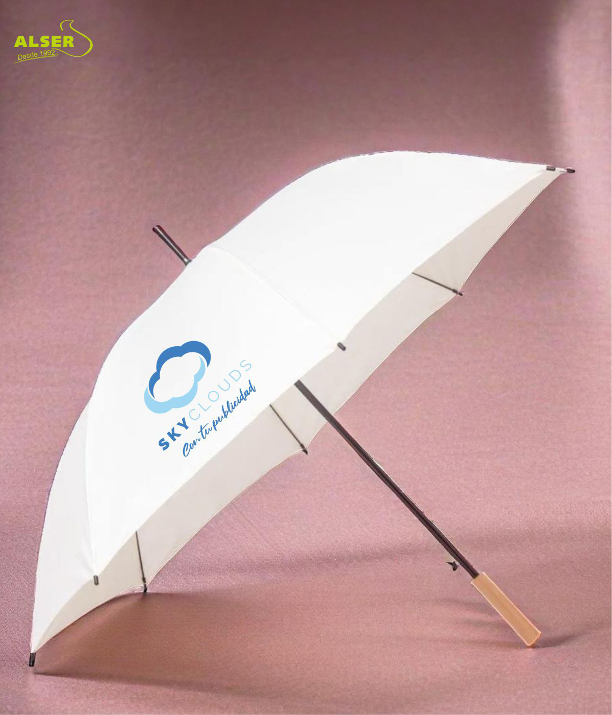El paragua xl también es una oportunidad para destacar tu marca en ferias y eventos. La tela en acabado natura y su enorme tamaño lo convierten en el lienzo perfecto para imprimir tu logotipo a todo color.