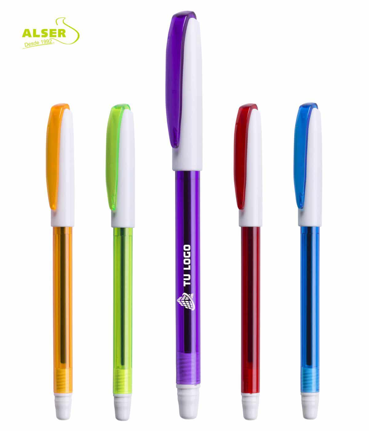 Lo tienes en varios colores: Azul, Morado, Naranja, Rojo y Verde. Todos con capuchón blanco y clip a juego. Los puedes comprar de un solo color, o comprarlos en colores variados.